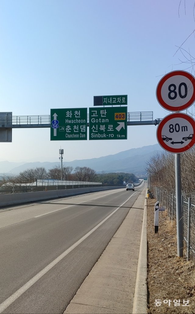 강원 춘천시 신북읍 지내리 국도 5호선 화천 방면. 왕복 4차로의 자동차전용도로를 달리다보면 지내교차로 1㎞ 전방에서 도로표지판을 만난다. 직진은 화천과 춘천댐, 우회전은 고탄과 신북로로 표기돼 있다. 지내교차로 500m 전방에 있는 도로표지판도 마찬가지다. 지내교차로에 거의 근접해 설치된 2개의 표지판에는 직진 안내가 없고 우회전만 고탄과 신북로로 표기돼 있다.