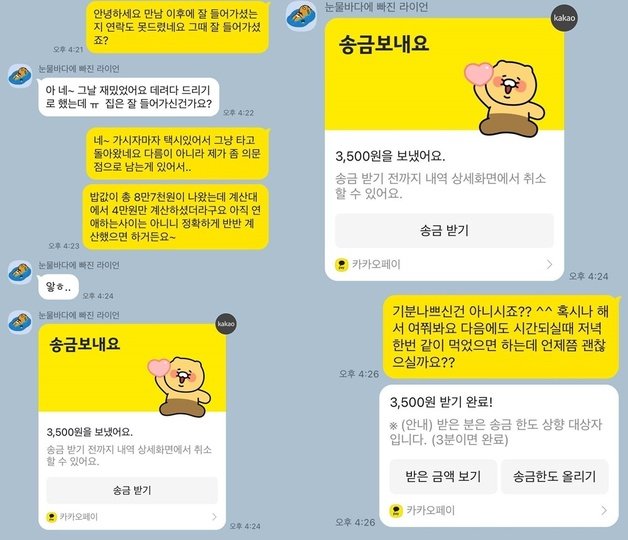 B씨는 곧 바로 ‘3500원’을 송금했고, A씨는 “기분 나쁜 건 아니냐. 혹시 다음에도 시간될 때 저녁 한번 같이 먹었으면 하는데 언제쯤 괜찮냐”고 다음 만남을 신청했다.