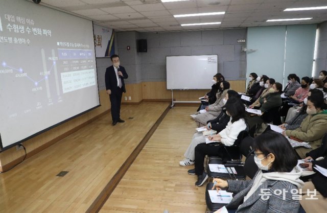 21일 서울 강동구 미래교육혁신센터에서 열린 ‘2024학년도 대입 전략 설명회’를 찾은 예비 수험생과 학부모들이 남윤곤 메가스터디 입시전략연구소장의 특강을 듣고 있다.