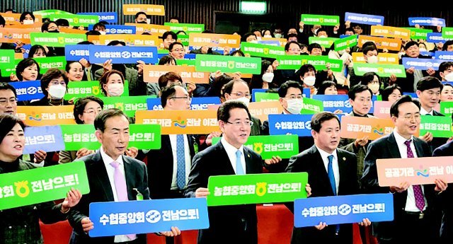 전남도시군의회의장협의회도 15일 국가 균형발전과 농어업의 공익적 가치 보존을 위한 ‘농협·수협중앙회 본사 전남 이전 촉구 건의안’을 만장일치로 채택하고 관련법 개정을 촉구했다.
