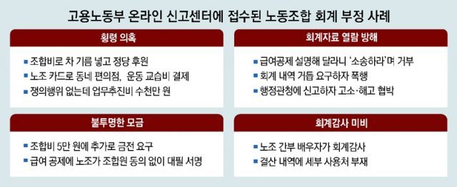 위 사례는 고용노동부가 ‘온라인 노사 부조리 신고센터’를 통해 13일까지 접수한 노조 회계 관련 신고 중 일부다. 1월 26일부터 이날까지 총 396건의 신고가 접수됐고 노조 회계 관련 신고는 수십 건에 이른다.