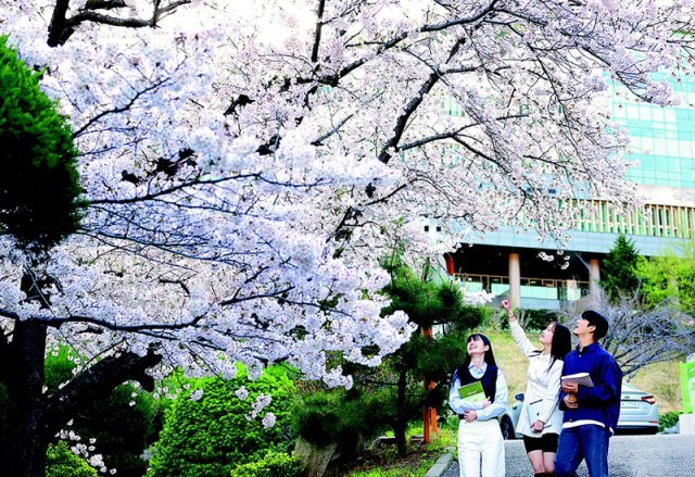 봄철 벚꽃 명소로 자리 잡은 대학 캠퍼스 매년 3월 말 벚꽃이 피는 인제대 김해캠퍼스는 지역사회의 봄철 명소로 자리매김하고 있다. 29일 학생들이 벚나무 아래에서 즐거운 시간을 보내고 있다. 인제대 제공