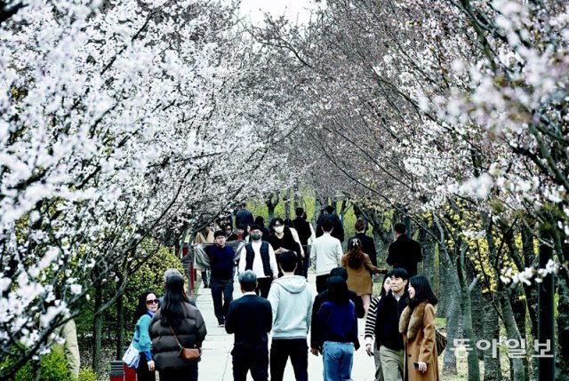 아들(3)과 함께 윤중로를 찾은 김상호 씨(42)는 “오랜만에 쉬는 날이라 아이와 꽃을 보러 나왔다”며 “다음 달 시작하는 벚꽃 축제에도 꼭 오고 싶다”고 했다. 친구들과 윤중로를 찾은 대학생 김주은 씨(27)는 “학교 시험을 마치고 신촌에서부터 자전거를 타고 왔다”며 “마스크를 벗고 즐기니 봄이 성큼 다가온 게 느껴진다”고 했다.