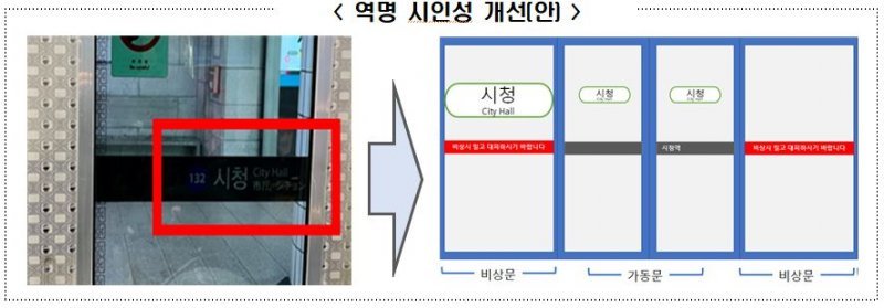 시는 “△디자인 개선 및 글자 확대 △대형·소형 두가지 유형의 역명 표지 부착 등 다양한 방식으로 개선 한다”며 “열차 내 모든 곳에서 도착역 정보를 쉽게 확인할 수 있도록 부착 지점 및 표지 유형을 다양화 한다”고 설명했다.