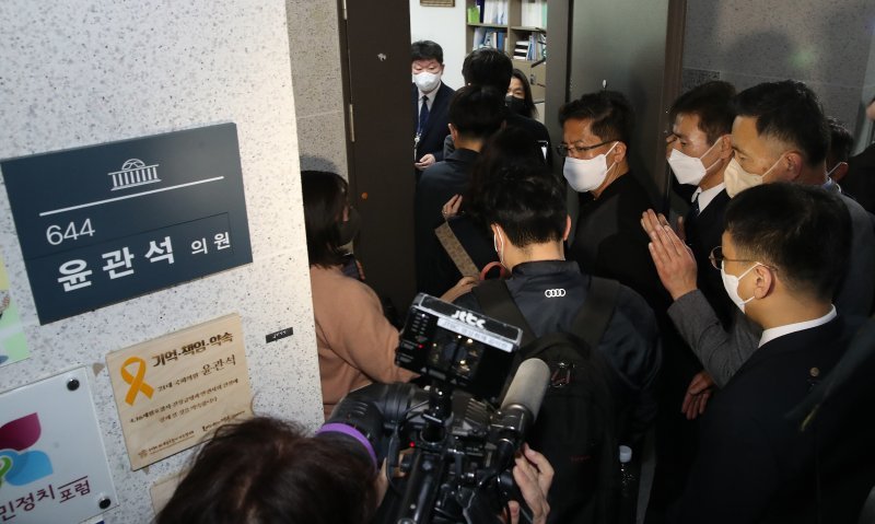 검찰이 민주당 전당대회 불법 정치자금 수수 의혹과 관련해 윤관석 더불어민주당 의원 등에 대한 압수수색을 실시한 12일 서울 여의도 국회의원회관 윤 의원 사무실로 검찰 수사관들이 들어서고 있다. 2023.4.12/뉴스1