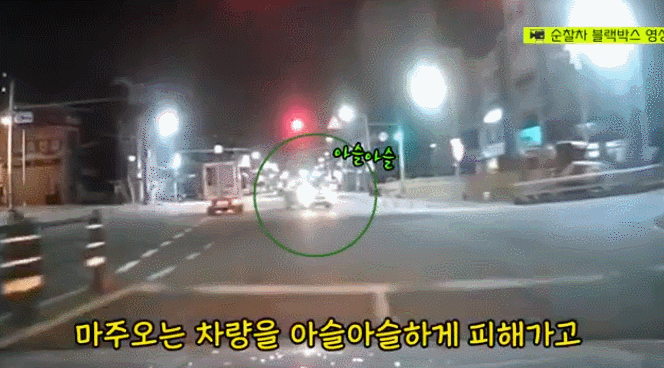 경찰이 공개한 폐쇄회로(CC)TV, 차량 블랙박스 영상에서 A 씨는 신호를 무시한 채 마주 오는 차량과 막아서는 순찰차를 아슬아슬하게 피해가며 도주했다.