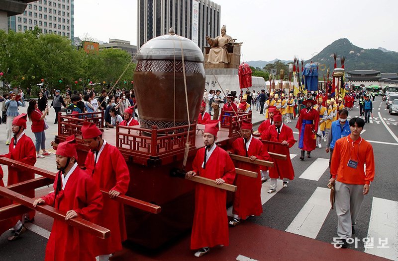 2일 서울 광화문광장 일대에서 세종대왕자 태실 태봉안의식 재현행사가 열리고 있다. 이날 경북 성주군 축제추진위원회의 주최로 열린 이 행사에선 세종대왕 왕자들의 탯줄을 한양에서 성주로 모셔가는 의식을 재현했다. 경북 성주군 월항면에 있는 세종대왕자 태실(사적 제444호)에는 세종대왕의 왕자 18명과 손자 단종의 탯줄이 봉안돼 있다.