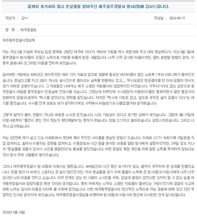 해당 사연은 A 씨가 지난 4월 17일 제주경찰청 ‘칭찬합니다’ 게시판에 ‘끝까지 포기하지 않고 분실물을 찾아주셔서 감사하다’는 내용의 글을 올리며 전해졌다.