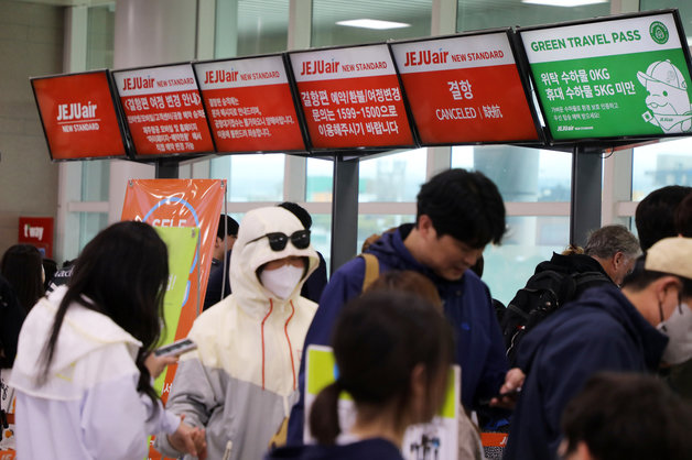 4일 오후 제주국제공항 3층 출발장에 있는 한 항공사 발권 창구 앞에 대체 항공편을 구하려는 이용객들로 붐비고 있다. 2023.5.4. 뉴스1