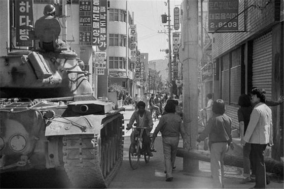 한국일보가 공개한 5·18민주화운동 당시 미공개 사진. 5·18 당시 광주 동구 금남로 한 골목에 계엄군의 탱크가 들어오고 있다. ⓒ News1DB