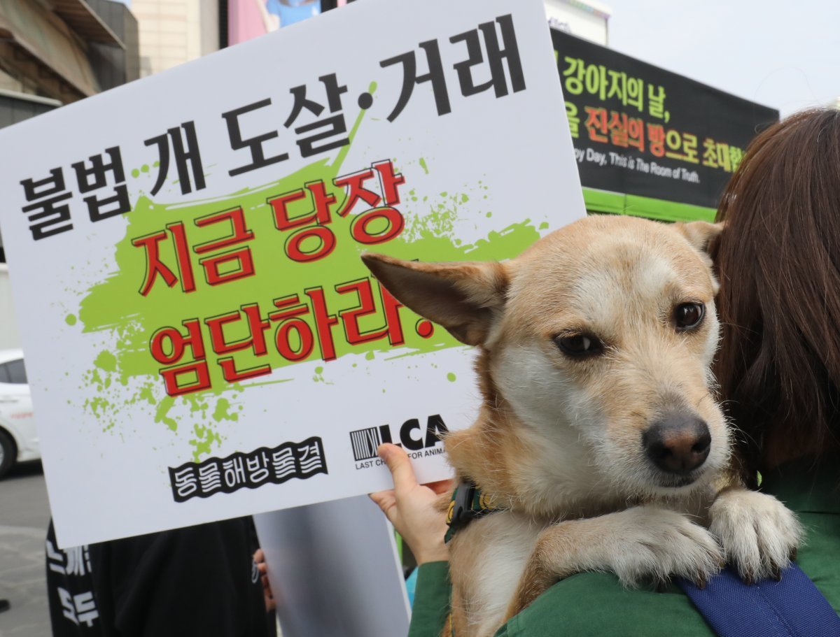 23일 서울 서대문구 신촌 유플렉스 앞 스타광장에서 동물해방물결 회원들이 ‘국제 강아지의 날’을 맞아 개 식용 문제의 종식을 촉구하는 기자회견을 하고 있다. 2023.3.23/뉴스1