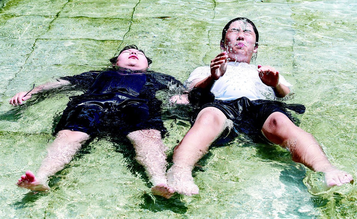 어린이들이 3일 서울 송파구 성내천 물놀이장에서 더위를 식히기 위해 물속에 몸을 담그고 있다. 서울은 이날 최고기온이 34.9도까지 오르며 무더위가 기승을 부렸다.