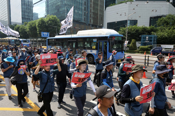 민주노총 서비스연맹 특수고용노동자들이 3일 오후 서울 세종대로 동화면세점 앞에서 특수고용노동자 임금인상, 노조법 2,3조 개정, 윤석열 정권 퇴진 등을 촉구하며 서울고용노동청 방면으로 행진하고 있다. 2023.7.3. 뉴스1