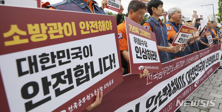 전국공무원노조 소방본부는 5일 오전 10시50분께 서울 용산구 전쟁기념관 앞에서 ‘출범 2주년 기념 기자회견’을 열고 정부에 소방 공무원의 처우 개선을 요구했다.