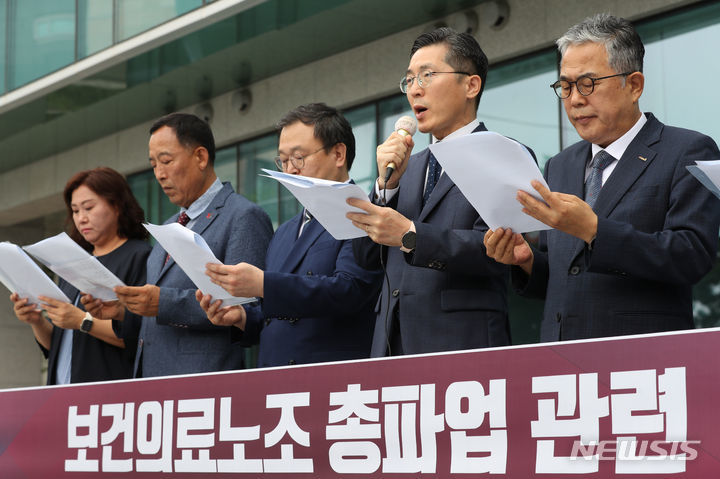 의료연대는 12일 서울 용산구 대한의사협회 정문 앞에서 긴급 기자회견을 열고 “13일로 예고된 보건의료노조의 총파업에 우려를 표한다”며 “긴박한 필수의료 현장에서 보건의료 종사자들이 대거 이탈하게 된다면 환자의 생명을 실질적으로 위협하는 중대한 결과를 초래할 가능성이 커 심히 염려된다”고 밝혔다.