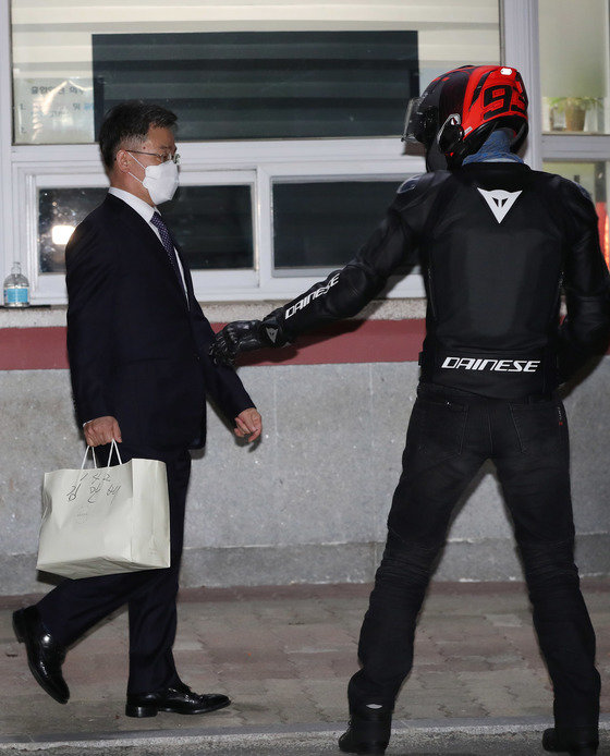 경기 성남시 대장동 개발사업 특혜 의혹의 핵심 인물이자 화천대유의 대주주 김만배 씨가 15일 새벽 경기도 의왕시 포일동 서울구치소에서 구속영장이 기각된 후 밖으로 나와 바이크 헬멧을 쓴 최우향 화천대유 자산관리 이사의 도움을 받고 있다. . 2021.10.15/뉴스1