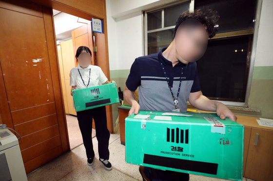 검찰 오송참사 수사본부 관계자들이 지난 24일 오후 충북도청 자연재난과 등을 압수수색한 뒤 압수품을 들고 도청을 빠져나가고 있다. 2023.7.24/뉴스1