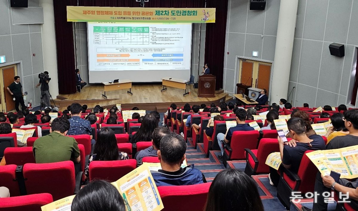 24일 제주시 연동 제주월컴센터에서 열린 제주형 행정체제 도입을 위한 도민경청회에서 지역 주민들이 다양한 의견을 개진하며 높은 관심을 보였다. 임재영 기자 jy788@donga.com