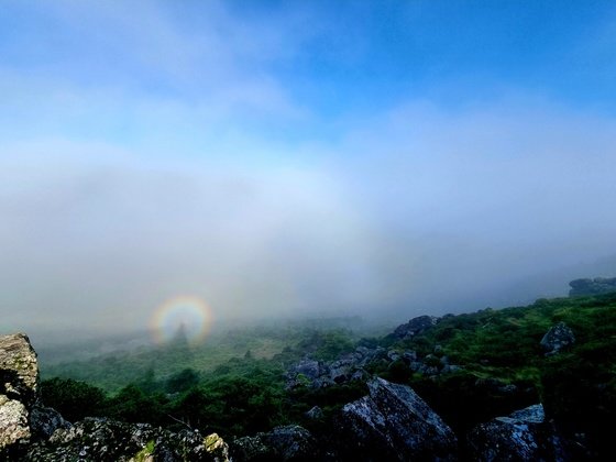 3일 오전 제주 한라산국립공원 정상에서 브로켄 현상이 목격됐다. 브로켄은 태양을 등지고 섰을 때 사람이나 사물의 그림자 주변에 무지개 띠 같은 형상이 나타나는 현상으로, 독일 브로켄 산에서 처음 목격돼 같은 이름이 붙여졌다. (독자 제공) 2023.8.3. 뉴스1기상현상인지 몰랐던 과거에는 요괴나 귀신으로 오해했다고 한다. 현재는 행운을 상징하는 신비로운 현상으로 받아들여진다.