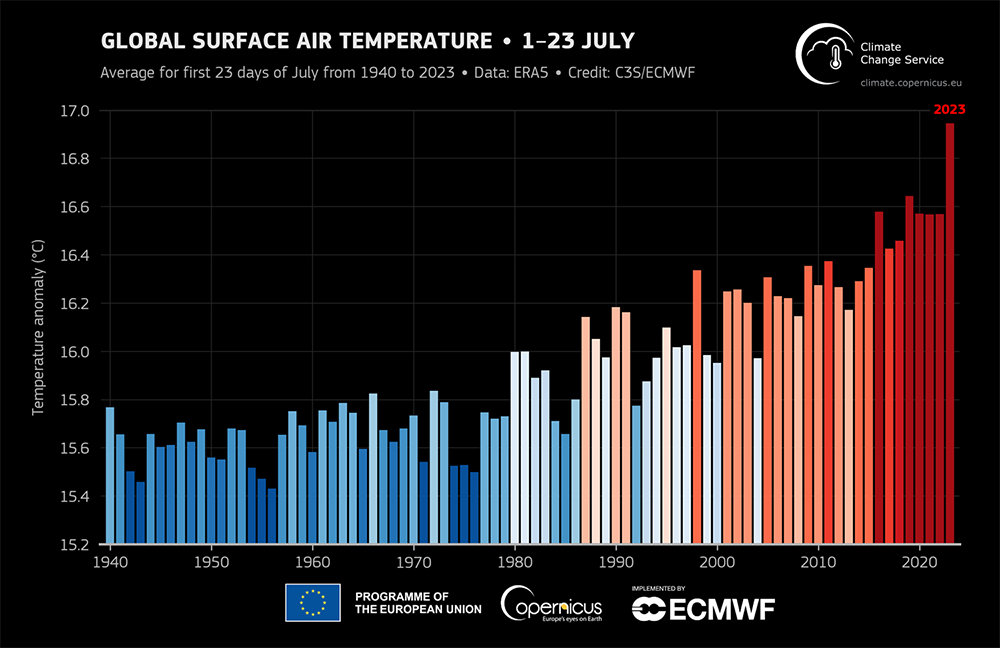1940년부터 2023년까지 전 세계 7월 온도 변화다. 최근 10년만 보더라도 2013년 섭씨 16.2도였지만 올해 7월의 평균 온도는 16.95도로 10년새 0.7도 이상이 높아졌다.(유럽연합 코페르니쿠스 기후변화서비스 제공)