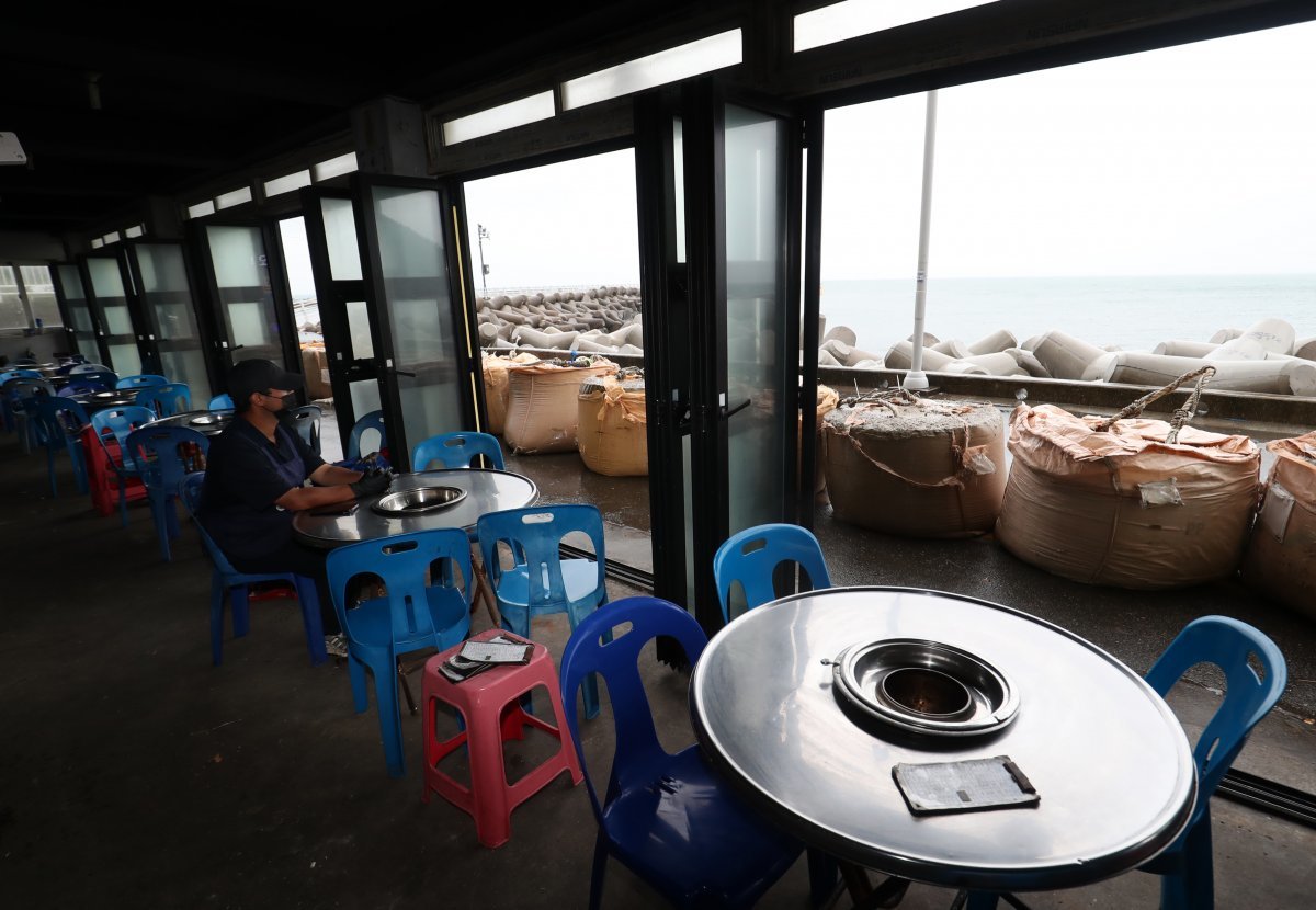 “침수 피해 막자” 제6호 태풍 ‘카눈’의 북상을 앞둔 9일 오후 부산 해운대구 해안가의 한 식당 앞에 피해를 대비하기 위한 콘크리트 주머니들이 놓여 있다. 부산=뉴스1