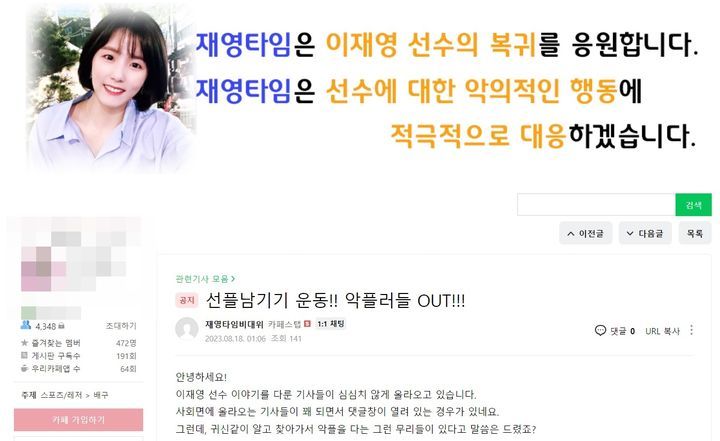 지난 20일 ‘재영타임’은 네이버 카페를 통해 “이다영 선수 인스타그램에 입에 담지 못할 수준의 메시지가 보내졌다”며 “악플이 작성된 웹사이트를 캡처해 자료를 수집할 수 있도록 동참해달라”고 전했다.