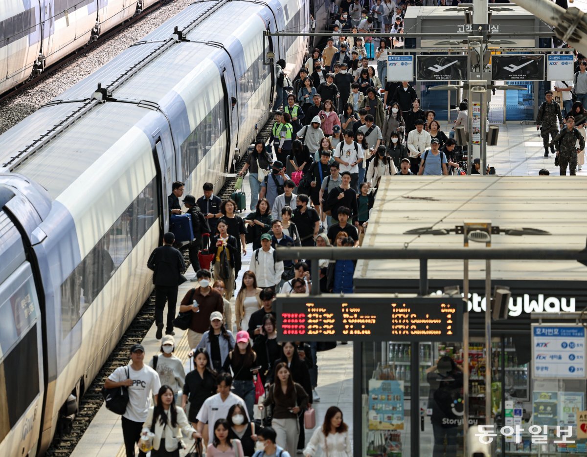 추석 연휴 닷새째인 2일 오후 서울 용산구 서울역 승강장이 승객들로 북적이고 있다. 이날 고향 방문을 마친 귀경객들이 몰리면서 기차역과 고속버스터미널은 인파로 북새통을 이뤘다. 일부 고속도로는 휴일 나들이 차량까지 몰리면서 극심한 정체가 빚어졌다.