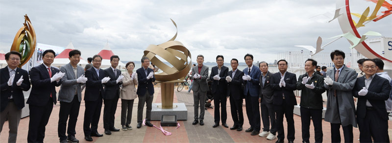 7일 경북 포항시 북구 영일대해수욕장에서 열린 포항스틸아트페스티벌 개막식에서 이강덕 포항시장(오른쪽에서 아홉 번째)을 비롯한 참석자들이 전시회 시작을 알리는 작품 제막식을 마친 뒤 박수 치고 있다. 포항시 제공