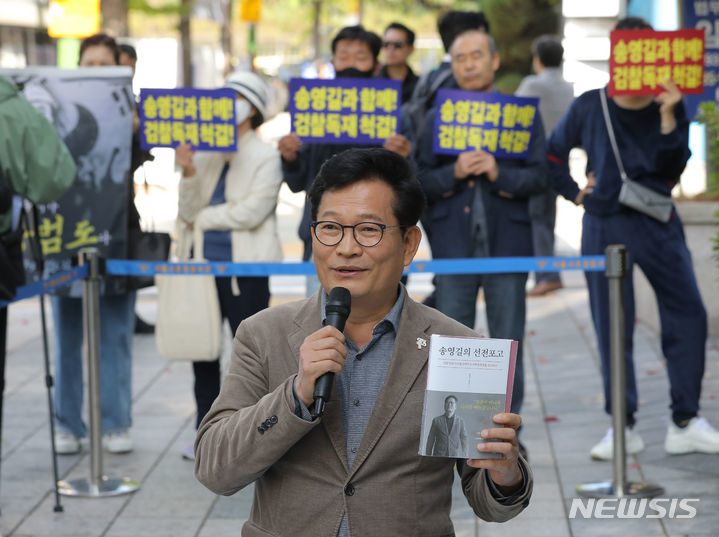 송 전 대표는 이날 오전 서울중앙지검 앞에서 ‘검찰범죄 카르텔 전체주의세력 규탄 농성’을 시작하며 “더 이상 집에 앉아서 압수수색에 당하지 않겠다”며 이같이 말했다.