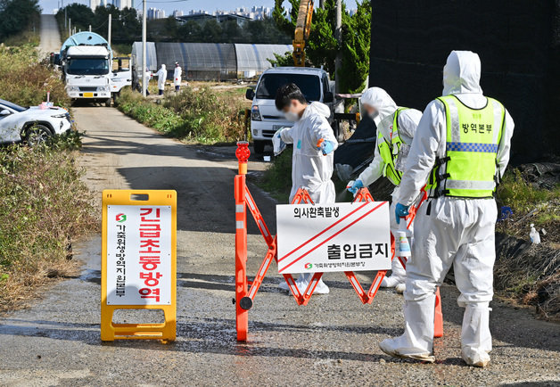 충남 서산에서 국내 첫 소 바이러스성 질병인 ‘럼피스킨병’(Lumpy Skin Disease)이 발생한 지 이틀째인 21일 경기 평택과 충남 당진에서도 확진 사례가 나왔다. 21일 오후 럼피스킨병이 발생한 경기 평택시의 한 젖소 농가에서 관계자들이 출입을 통제하고 있다. (경기일보 제공) 2023.10.21/뉴스1 ⓒ News1