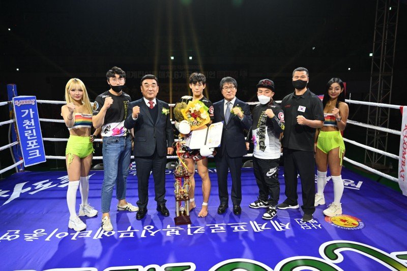 지난해 열린 ‘2022 K-COMBAT 웰터급 세계 챔피언 타이틀매치 울산대회’ 기념 촬영 모습. K-COMBAT 세계 프로킥복싱 무에타이 총연맹 제공