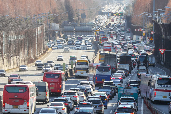 지난해 설 명절 연휴 서울 서초구 잠원IC를 지나는 경부고속도로 하행선이 귀성 차량들로 정체를 빚고 있다. 2023.1.20. 뉴스1