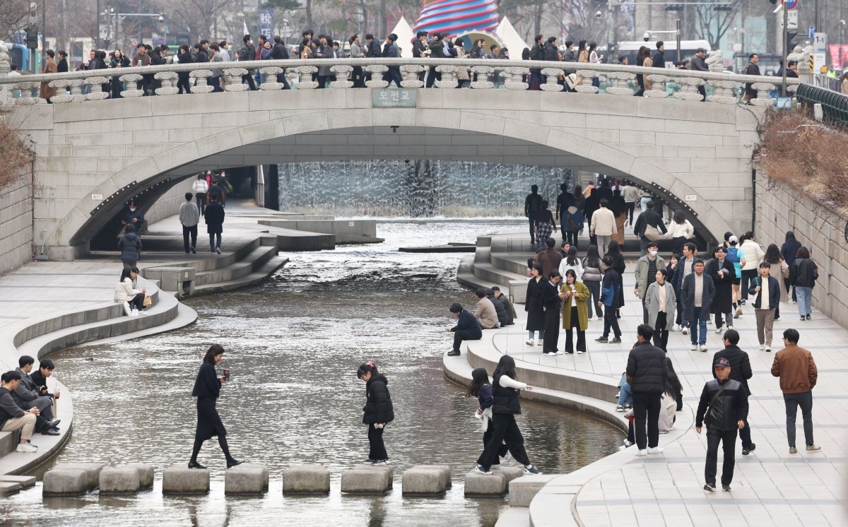 14일 서울 청계천에서 시민들이 포근한 날씨를 즐기고 있다. 이날 서울은 최고기온 18.3도로 1907년 기상 관측 이후 두 번째로 높은 2월 기온을 보였다. 전남 완도군은 20.4도로 역대 가장 따뜻한 2월 날씨를 기록했다. 기상청은 “13일부터 따뜻한 남풍이 계속 유입되며 기온이 평년 대비 10도가량 높았다”며 “15일 아침 최저기온은 3∼12도, 낮 최고기온은 3∼16도로 전날보다 다소 떨어질 것”이라고 밝혔다.