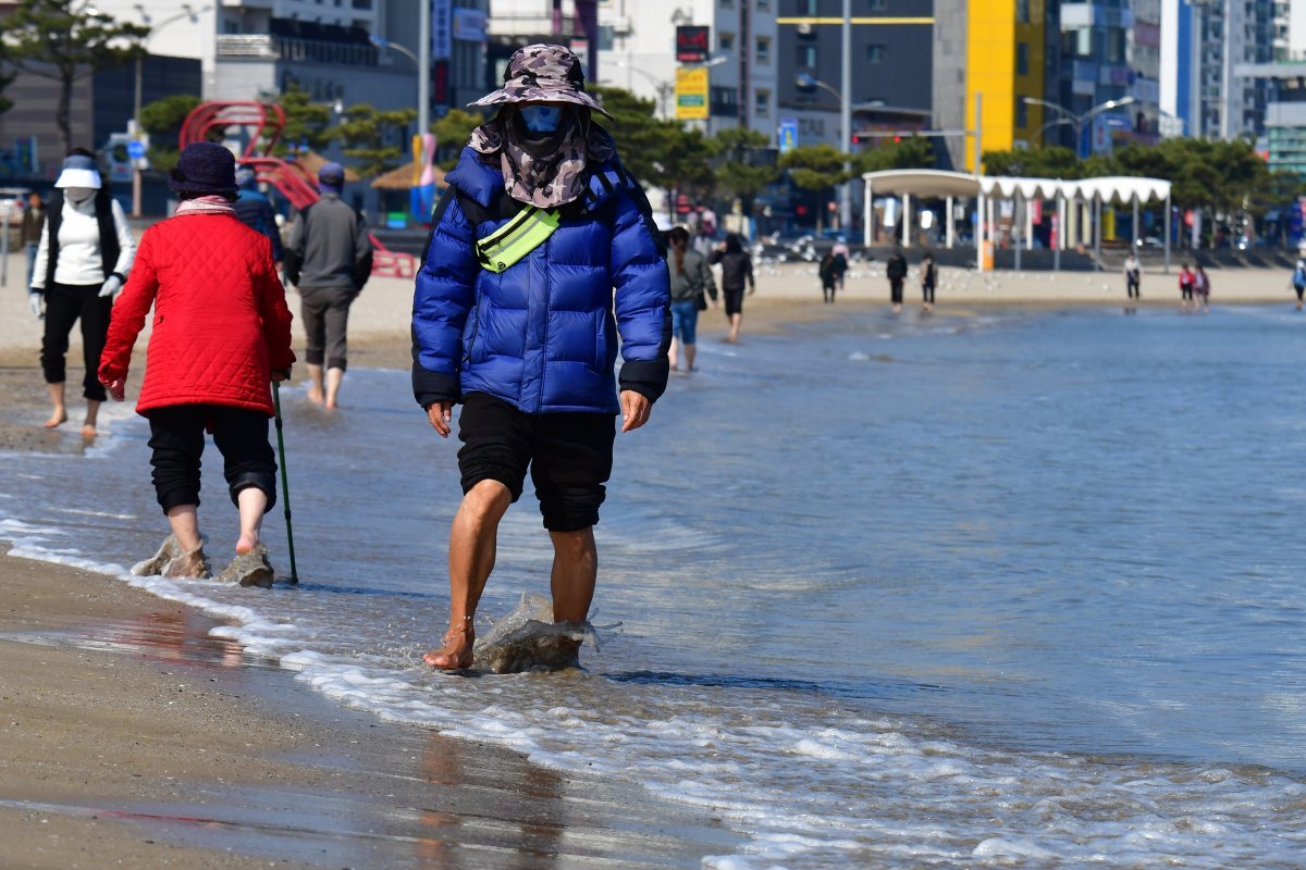 경북 포항시의 낮 최고 기온이 17.3도까지 올라간 14일 오후 영일대해수욕장에서 시민들이 바닷물에 발을 담그고 있다. 2024.3.14 뉴스1