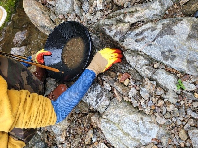 물에 흔들어 사금을 찾는 패닝 접시를 이용하거나 투명 플라스틱 병밑에 돋보기를 달아 물이 흐르지 않는 고여있는 곳 바위 틈 아래 가라앉은 사금을 채취하고 있다.