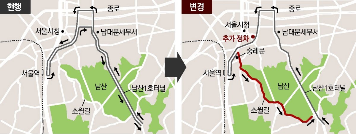 우선 용산구 서울역과 경기 성남시 판교를 오가던 9003번과 9300번 등 2개 노선의 회차 지점을 다음 달 29일부터 남산 남단인 서울 용산구 이태원동의 소월길로 옮긴다. 이들 버스는 현재 도심으로 진입할 때와 빠져나갈 때 모두 남산1호터널을 지난다. 명동과 경기 남부권을 오가는 다른 30여 개 광역버스 노선과 뒤엉켜 이 일대의 혼잡이 극심한 상황이다.