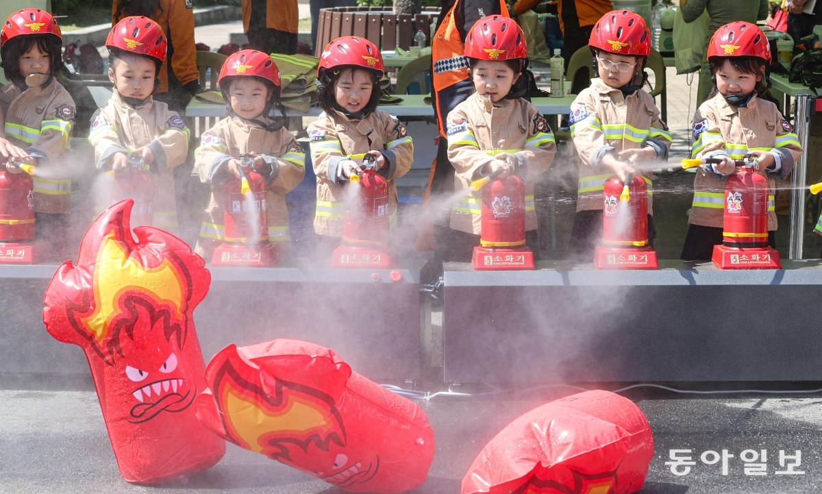 “화재 진압!” 어린이 소방관들 소화기 체험