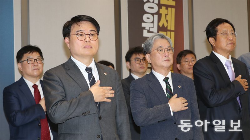임현택 신임 대한의사협회(의협) 회장(앞줄 왼쪽)은 2일 서울 용산구 의협 강당에서 열린 취임식에서 “의대 증원 승인 보류를 요구한 사법부의 판단을 존중한다”며 “과학적 근거를 제시해 정부가 진행하는 정책이 얼마나 한심한지 깨닫도록 하겠다”고 말했다.