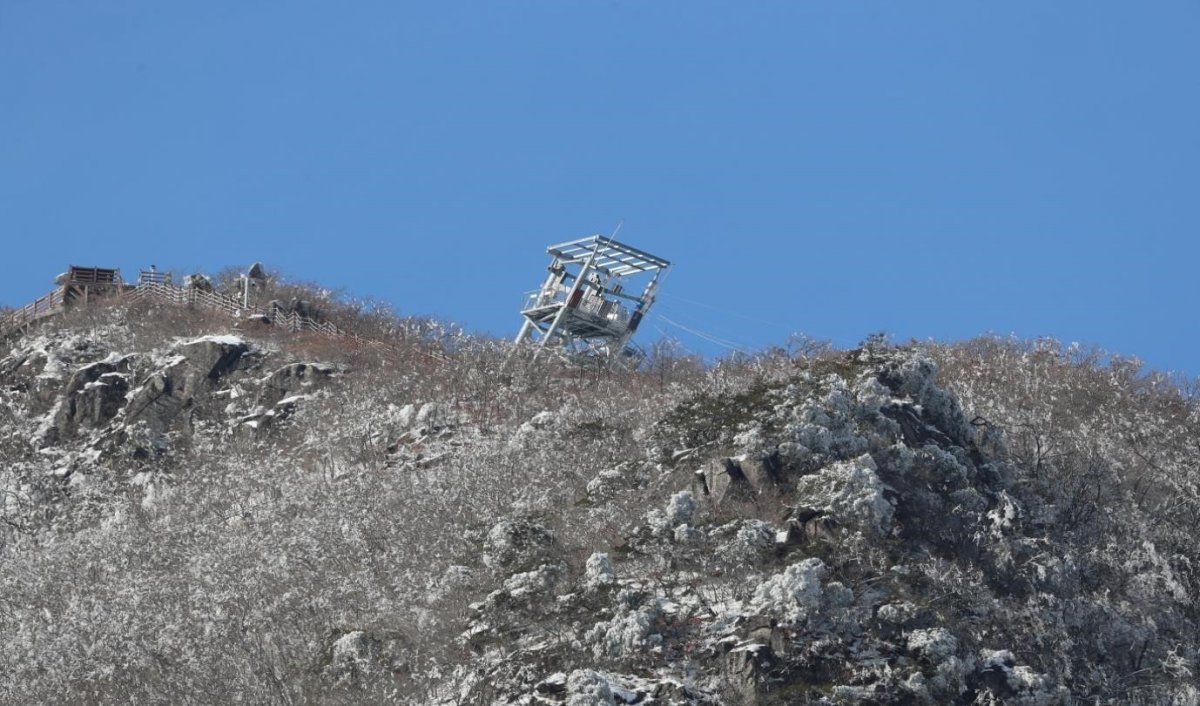 경남 함양군 대봉산(1252m) 집라인 기울어짐 사고는 와이어로프가 상고대 무게를 못 이겨 발생한 것으로 조사됐다.