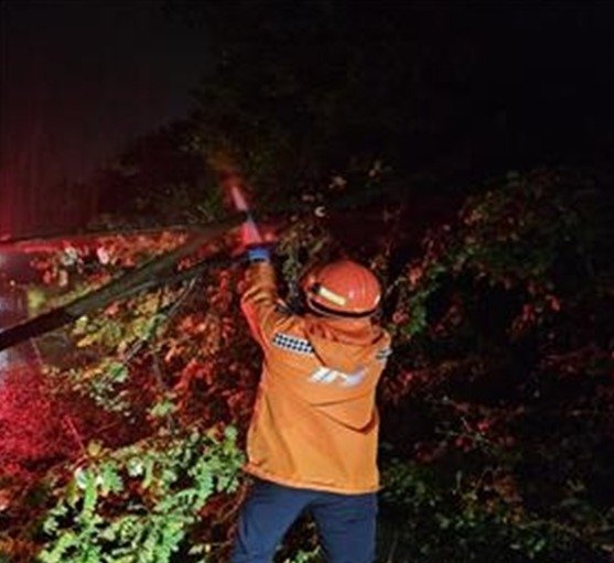 5일 오후 9시 22분쯤 부산 기장군 일광읍 한 도로에서 큰 나무가 쓰러지고 토사가 흘려내려 도로 교통에 장애가 발생했다.(부산소방재난본부 제공)