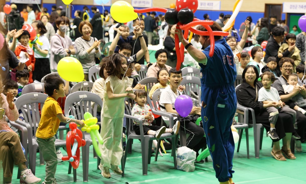 많은 비가 내린 5일 전남 강진군 종합운동장 실내체육관에서 열린 ‘청자골 어린이날 한마당 잔치’에서 어린이들이 풍선 아트 공연을 보며 즐거워하고 있다.