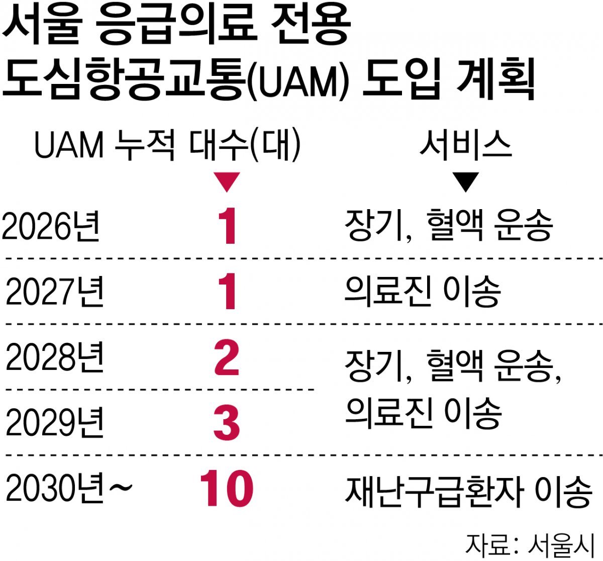 서울시는 이에 UAM을 활용한 서울형 민생 응급의료체계를 구상하기로 했다. 우선 2026년부터 UAM을 활용한 장기·혈액 운송 서비스를 시작한다. 이후 UAM 기술 발전 정도에 따라 2027년에는 의료진 이송, 2030년에는 재난·구급 환자 이송체계를 구축할 계획이다. 오 시장은 “서울에서 UAM 첫 이용자는 응급환자가 될 것”이라며 “UAM이 소수의 부유층을 위한 전유물이 아니라 서울시민을 위한 공공의료 서비스의 핵심 교통 수단이 될 것”이라고 강조했다.