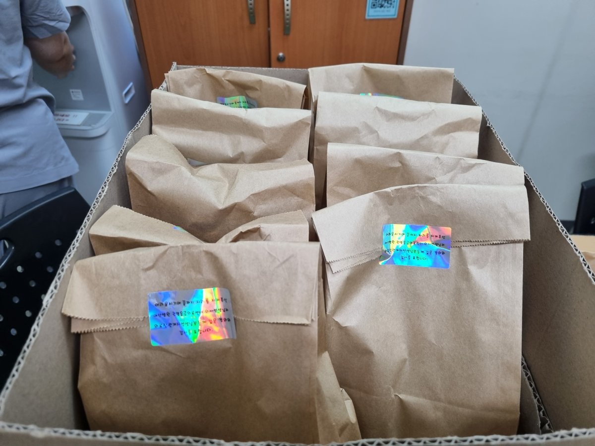 여성이 건네고 박스를 풀어보니 봉투 30개가 들어있었다. 봉투 하나 하나에는 꿀떡이 든 컵과 건강음료 1개가 들어있었다.