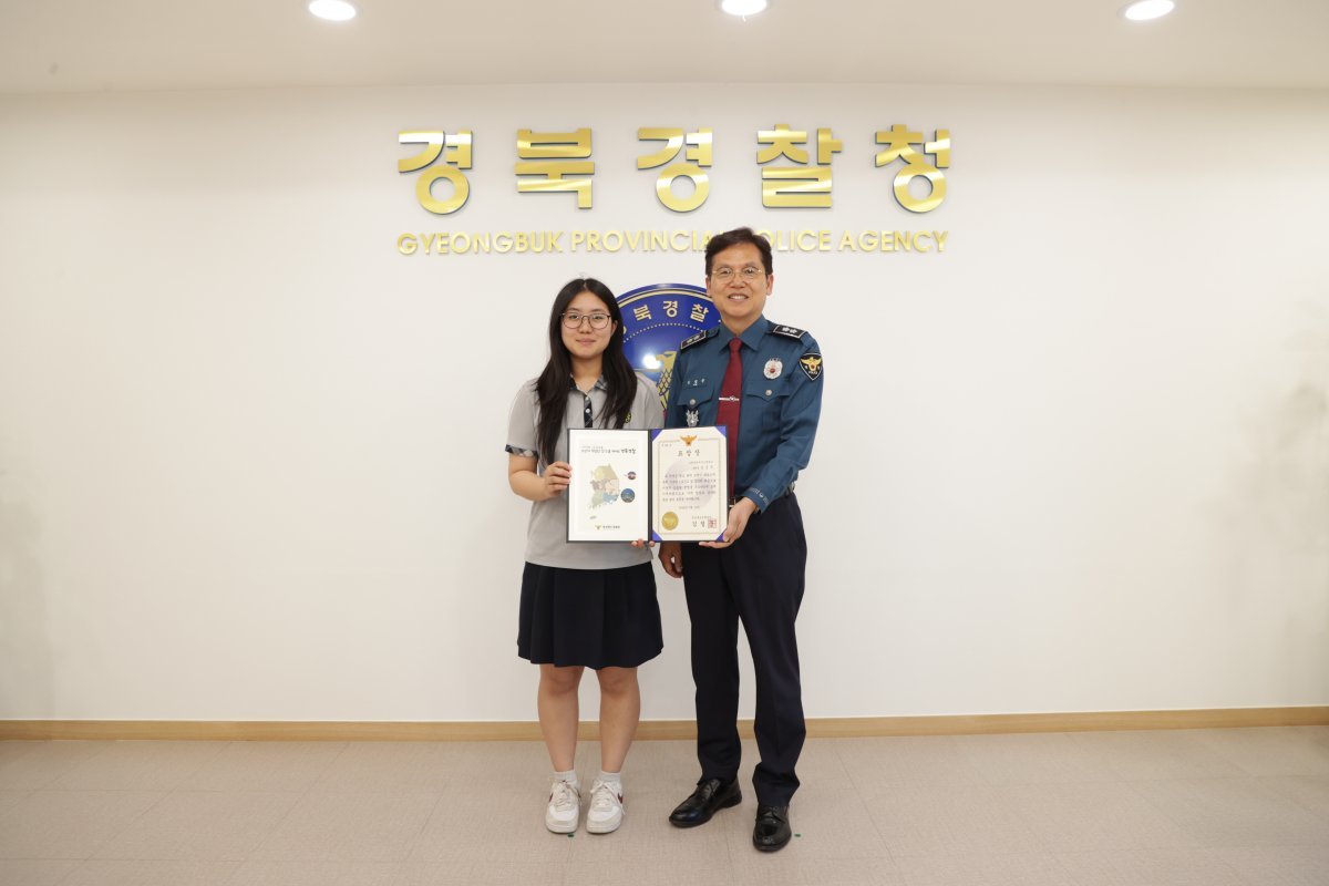 13일 경북 안동시 경북경찰청에서 김은우 양(왼쪽)이 김철문 경북경찰청장에게 표창장을 수여받은 뒤 기념촬영을 하고 있다. 경북경찰청 제공