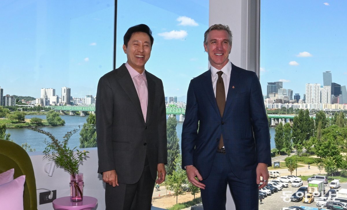 오세훈 서울시장(왼쪽)과 데이브 스티븐슨 에어비앤비 최고사업책임자(CBO)가 28일 오전 서울 용산구 한강대교 전망 호텔 ‘스카이