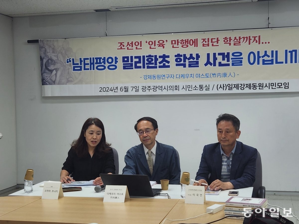 일제강제동원 연구자인 일본인 다케우치 야스토 씨(가운데)가 7일 광주시의회에서 ‘강제동원 조선인 남양 밀리환초 칠본섬에서의 저항과 학살’을 주제로 일제강제동원시민모임과 함께 기자회견하고 있다. 광주=이형주 기자 peneye09@donga.com
