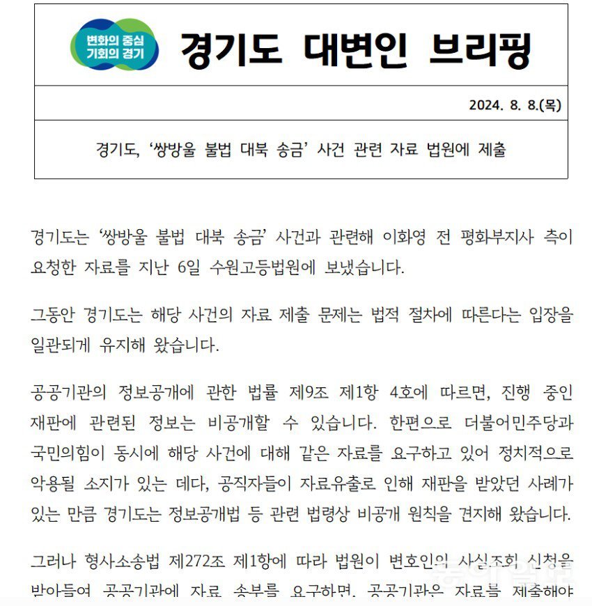 강민석 경기도 대변인은 서면 브리핑을 통해 “법원이 변호인의 사실조회 신청을 받아들여 자료 송부를 요구한 만큼 법적 절차에 따라 수원고법에 자료를 보냈다”라며 “법원에 보낸 북측 참석자와 행사 내용 등은 이미 여러 언론에 보도된 내용”이라고 설명했다.