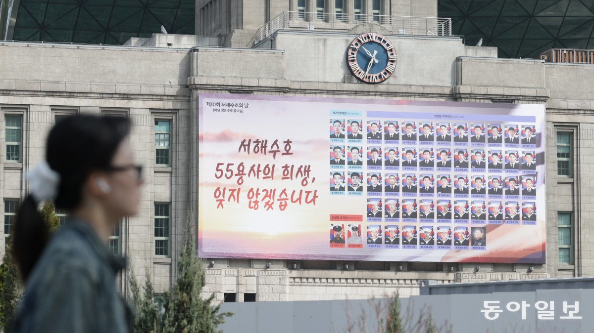 21일 서울 중구 서울도서관 외벽 꿈새김판에 제2연평해전, 천안함 피격, 연평도 포격 당시 숨진 군인들의 사진 및 이름과 ‘서해수호 55용사의 희생, 잊지 않겠습니다’라는 문구가 붙어 있다. 정부는 2016년부터 매년 3월 넷째 주 금요일을 법정기념일인 서해 수호의 날로 지정해 산화 장병을 추모하고 있다.