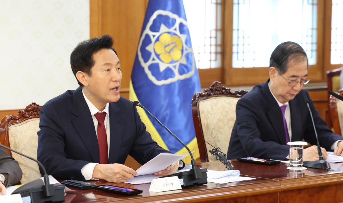 오세훈 서울시장이 25일 정부서울청사에서 열린 한덕수 대통령 권한대행 국무총리 주재 치안관계 장관회의에서 보고를 하고 있다. 2025.03.25. 서울=뉴시스