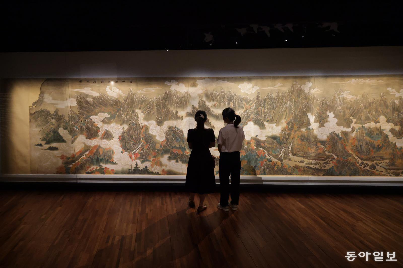 13일 서울 종로구 국립고궁박물관에서 시민들이 김규진 작 ‘금강산만물초승경도’를 감상하고 있다. 개관 20주년을 맞은 국립고궁박물관은 특별전 ‘창덕궁의 근사(謹寫)한 벽화’를 열어 창덕궁 내전을 장식했던 벽화 6점을 처음으로 한꺼번에 공개했다.